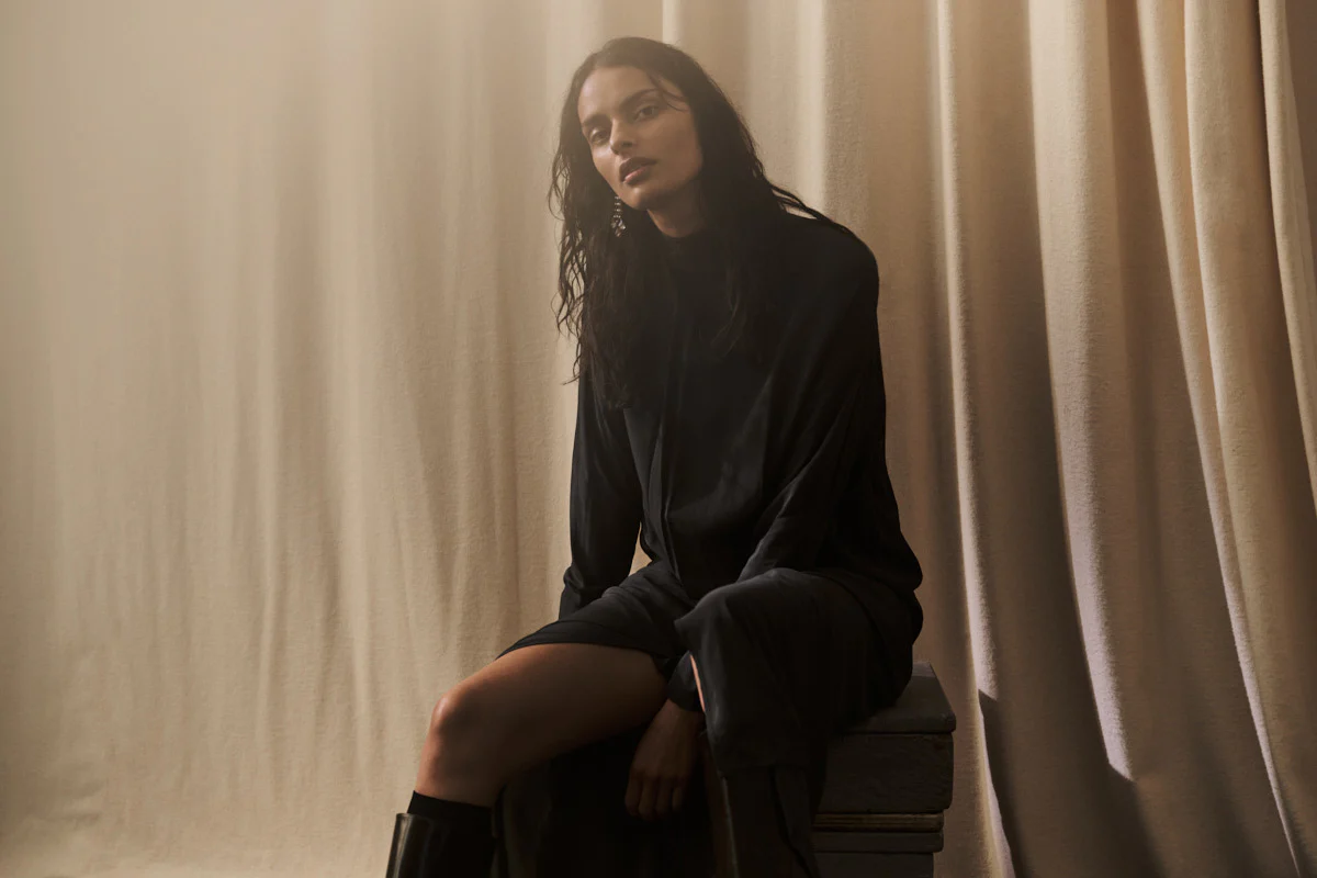 Kjolen er designet med en lang, afslappet silhuet, som skiller sig ud med raffinerede draperede detaljer. Den har lange ærmer, en høj hals og en diskret lynlås i nakken.